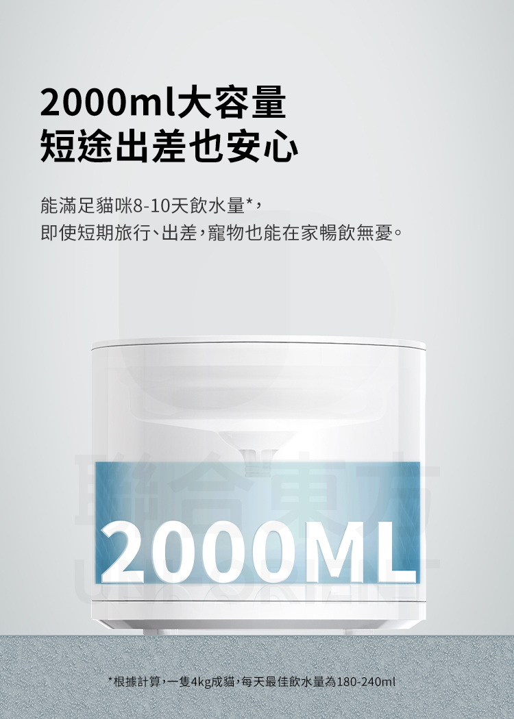 2000ml大容量,可供貓咪約8-10天飲水量,短期外出也不怕