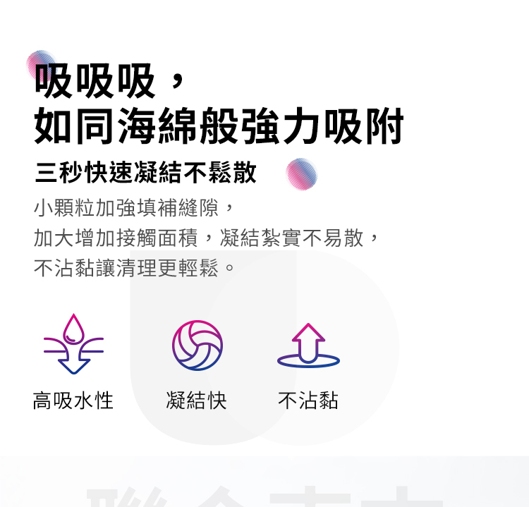 強效吸水,瞬間凝結,包覆性佳不沾黏